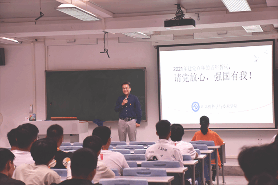 最后,刘群锋教授让同学们一起喊出2021年建党百年的青年誓词:“请党放心,强国有我!”通过这句话,强化学生们自己的责任意识,同时也鼓励了学生们要不断进步,在日后要成为中华强国的中坚力量。