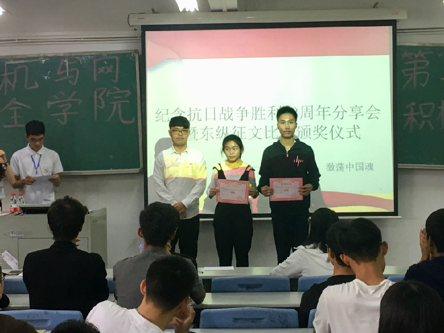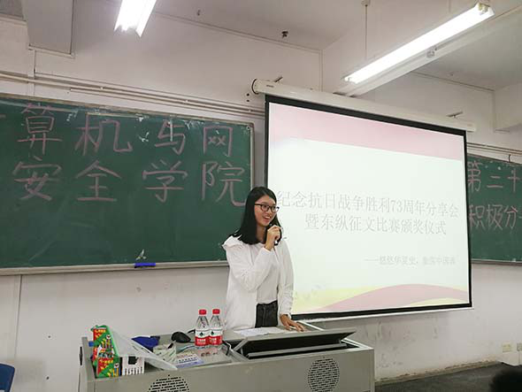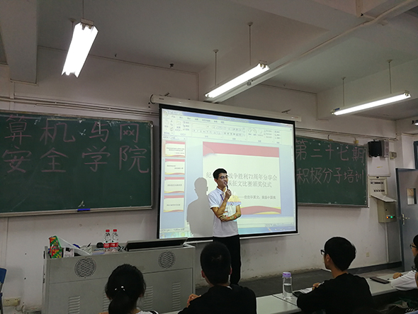 2018年10月18日下午17:00,计算机学院党建办于7B409召开纪念抗日战争胜利73周年分享会,本次会议的主持人是刘锦华同学,参与分享会的人员有学生支部书记周如川老师、征文比赛获奖选手和27期全体入党申请人。