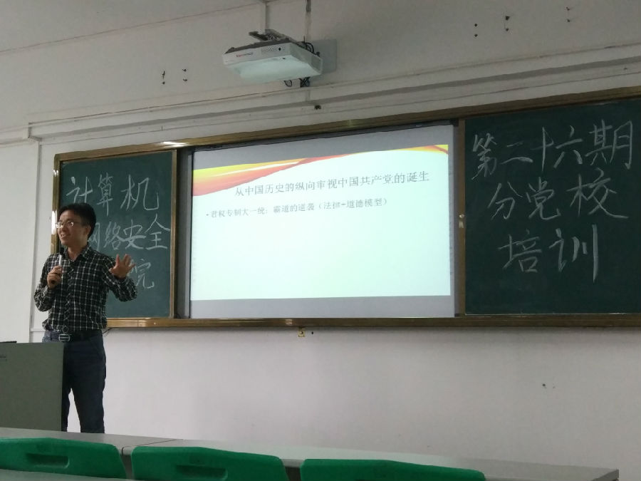 2018年5月10日下午14:30,计算机与网络安全学院党总支在7B311开展第26期第四次分党校培训,本次培训的主题是“中国共产党人的初心与使命”。计算机学院党总支教工二支部书记刘群锋老师为本次培训活动的主讲人,计算机学院第26期入党申请人参加了本次培训活动。