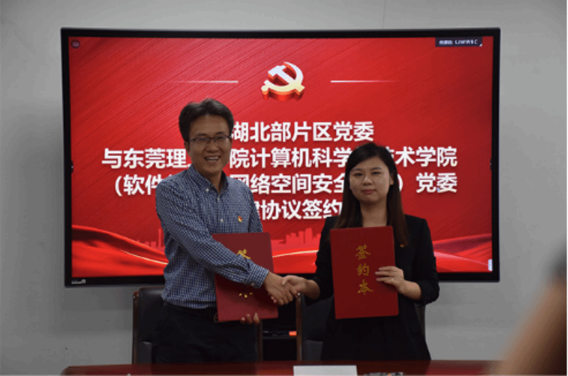 今年来,计算机学院党委成员和骨干教师多次走访松山湖北部众多企业,与企业开展了多项合作,并与松山湖北部片区党委成员建立了良好关系。在此基础上,5月22日下午,松山湖北部片区企业组团来我校开展专场招聘活动。同时,计算机学院党委与松山湖北部片区党委举行党建共建签约仪式,正式携手,优势互补,努力服务地方经济社会高质量发展。计算机学院党委书记刘群锋与松山湖北部片区党委副书记刘泉出席了签约仪式,部分企业代表也到场共同见证。