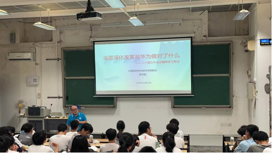 10月22日上午,计算机学院院长袁华强在6E-104教室为2024级计算机类7班、2024级网络空间安全1班和2024级网络空间安全2班的120名学生带来了新学期的“思政第一课”。本次课程紧密围绕党的二十届三中全会精神,以“全面深化改革与华为做对了什么”为主题,为新生们带来了一场深刻而生动的思想教育。