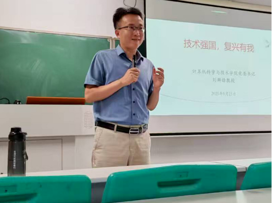 此外,刘群锋还引发同学们思考,抛出了中华民族持续发展领域、通用人工智能和通讯技术极限突破三大思考问题,号召青年担当,最后以“请党放心,强国有我”的青年誓词收尾,将国家战略与个人成长相关联,推动同学们将认知转化为投身技术创新、助力复兴的行动意识。