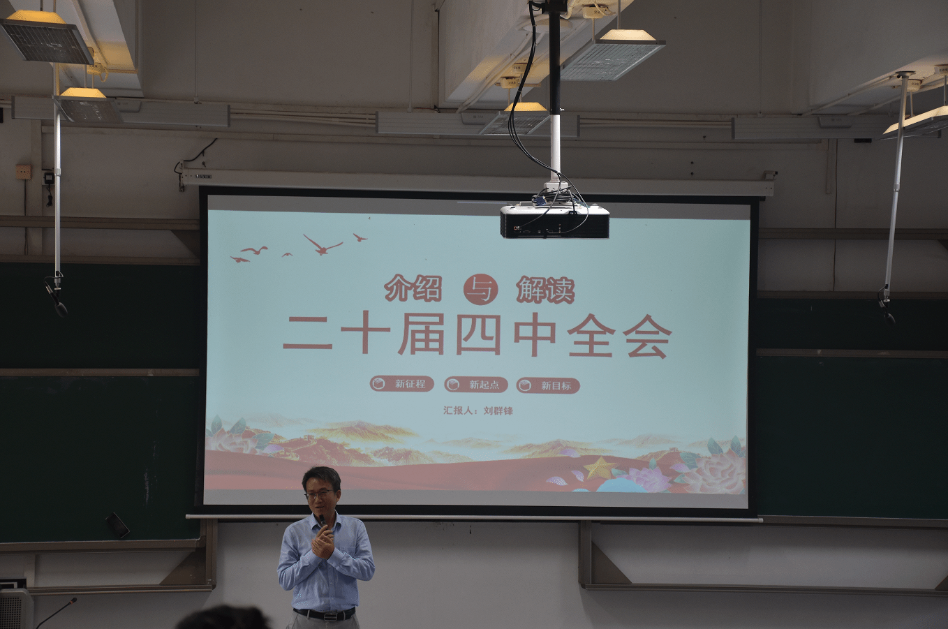 接着由刘群锋作“介绍与解读党的二十届四中全会”的宣讲报告。他结合学院的现实状况,对全会精神进行了深入阐释,详细讲述了“十五五”时期我国经济社会发展指导方针和经济社会发展必须遵循的六项重大原则,并对科技创新、新发展格局等领域进行了详细的阐释,还布置了最近学院的有关事务。
