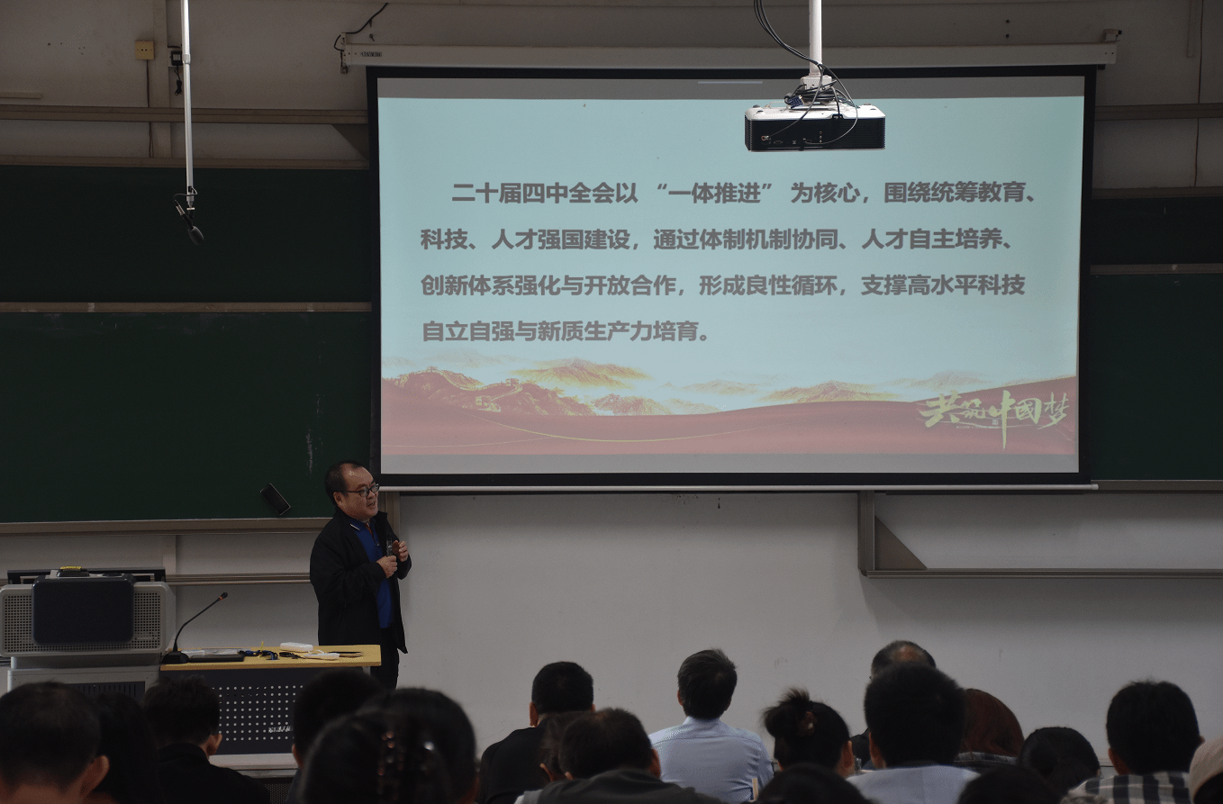 首先由袁华强作“党的二十届四中全会提出的新概念、新观点、新论断”的宣讲报告。他从“战略背景与时代意义”“国家战略需求与发展现状”“挑战研判与对策建议”“未来展望与发展方向”等角度,深入讲述了党的二十届四中全会精神在教育领域的体现。他强调,教育作为人才培养的根本途径,是实现科技自立自强和人才自主培养的源头活水,构成三位一体的逻辑起点。此外,袁华强还表示,要培养强化学生工程实践能力和产业问题应对能力,打通科研成果从实验室到课堂再到产业的“最后一公里”,培养适应时代需要的人才。