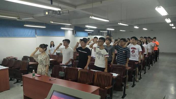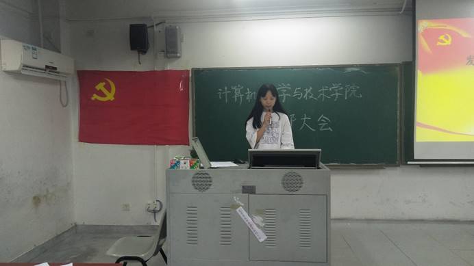 会议伊始,主持人李国歌老师汇报了本次会议的人员出席情况。紧接着,王佳灿等17位同志逐一上台总结讲述自己作为入党积极分子以来,在思想、学习、行动等方面的表现。汇报完毕后,发展对象暂时离席回避,入党介绍人对发展对象在考察期间的表现进行乐观的评价,并肯定地给出了是否同意该发展对象成为预备党员回答。在场的正式党员通过入党介绍人对发展对象的评价,用举手投票的方式进行表决,最终决定接收王佳灿等17位同志成为中国共产党党员。会议在庄重的宣誓声中缓缓落下帷幕,计算机学院党总支学生支部注入了一股新的力量。