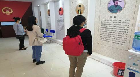 党支部党员同志认真观看展示墙上历代清廉的官员事迹,学习他们一心为民的事迹。