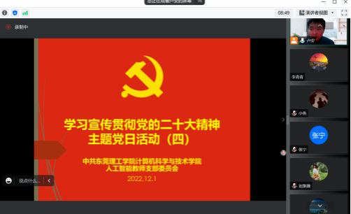 2022年12月1日下午三点,人工智能教师党支部开展学习宣传贯彻党的二十大精神主题党日活动,这次主题党日活动是党的二十大以来,人工智能教师党支部的第四次集中学习。会议由支部书记卢安主持。