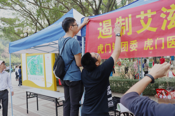 为了普及大众对艾滋病的了解,2018年12月1日,虎门镇团委、虎门医院、虎门镇疾病预防中心以及东莞理工学院在虎门公园联合举办了宣传艾滋病的志愿活动。