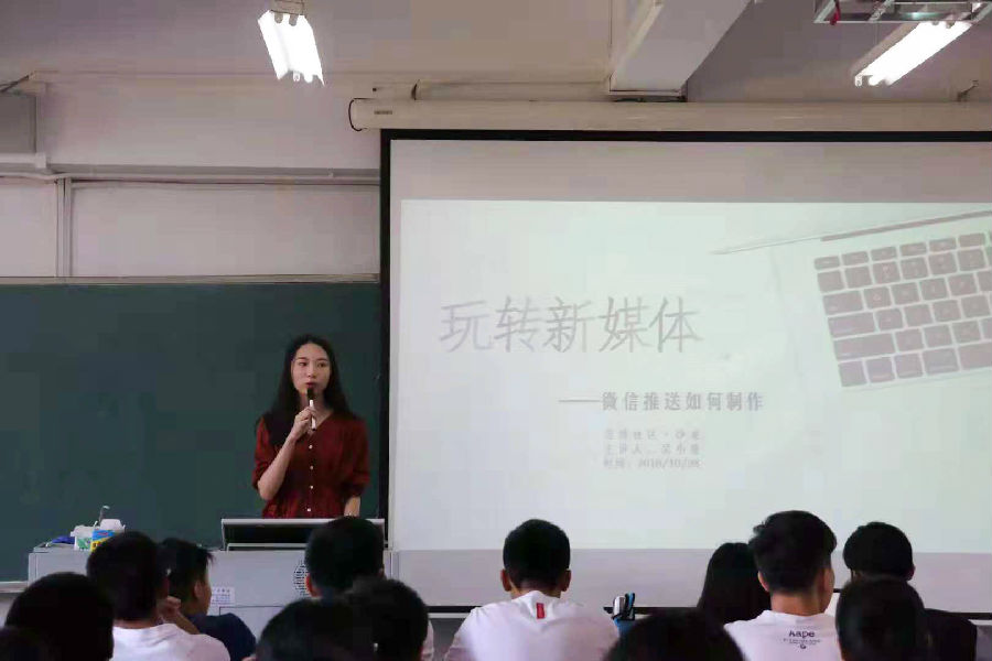 培训伊始,师姐为学生会全体进行了公众号分析,分别是:面向群体、内容输出以及基本要求。接着是对推文的排版,其中字体的范围大多在12~16号之间,文章内容字色多为深灰,师姐还解读了留白的妙处,推荐了两个优质公众号。第三个内容,就是推文的配色问题,配色大多分为纯色类、清新简约类和青春活泼类,面对不同的大众,要选择不同的风格,其中还有几个推荐的配色网站,其中代表性的就是“千图网”。接着就是告诉同学们选图的重要性,再着重讲的就是封面图的选择,师姐还告诉他们,封面图的选择不能过于粗略,因为这决定着阅读者的兴趣。接着师姐还列举了一些别有新意的封面图,之后还是例行地进行了网站的推荐。在最后的几个环节中,师姐介绍了程序的制作。同时还讲解了模板选择的四个原则:风格统一、配色和谐、简洁大方、没有出错。接着,师姐将标题分了一下类,传授同学们吸引读者的秘诀,结尾就是与读者的互动。