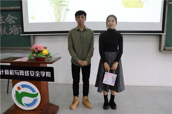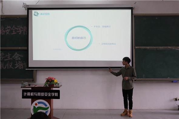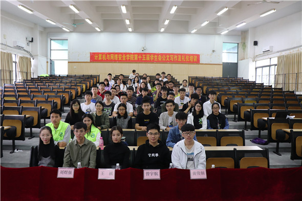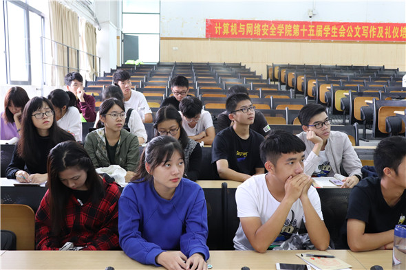 为提升公文写作能力,规范日常礼仪。计算机与网络安全学院第十五届学生会于2018年11月3日下午在松山湖校区综合教学楼6E307举行了公文写作及礼仪培训讲座,向学生会全体成员传授办公的基本技能和礼仪知识。本次会议由办公室干事张海生主持,负责公文写作培训的讲师是办公室副主任刘煜强师兄,负责礼仪培训的讲师是东莞理工学院司仪主持协会礼仪队队长王祺师姐,到场的嘉宾有辅导员赵海峰老师,学生会主席曾宇航师兄以及主席团助理黄俊炳师兄,参加讲座的是学生会全体成员。