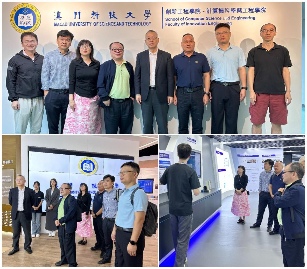 在澳门科技大学,出访团在计算机科学与工程学院助理院长李建庆教授及赵庆林教授的陪同下参观了校史与成就展厅、资讯科技展厅等场所,并与相关教职人员进行座谈。双方围绕学科发展趋势、课程设置、社区育人及智慧校园建设等方面展开了讨论。本次座谈增进了彼此之间的了解和友谊,拓展了双方在科研合作、教师互访互派、学生交流项目等方面的合作渠道,为进一步加强粤港澳大湾区高校之间的合作与交流搭建了桥梁。