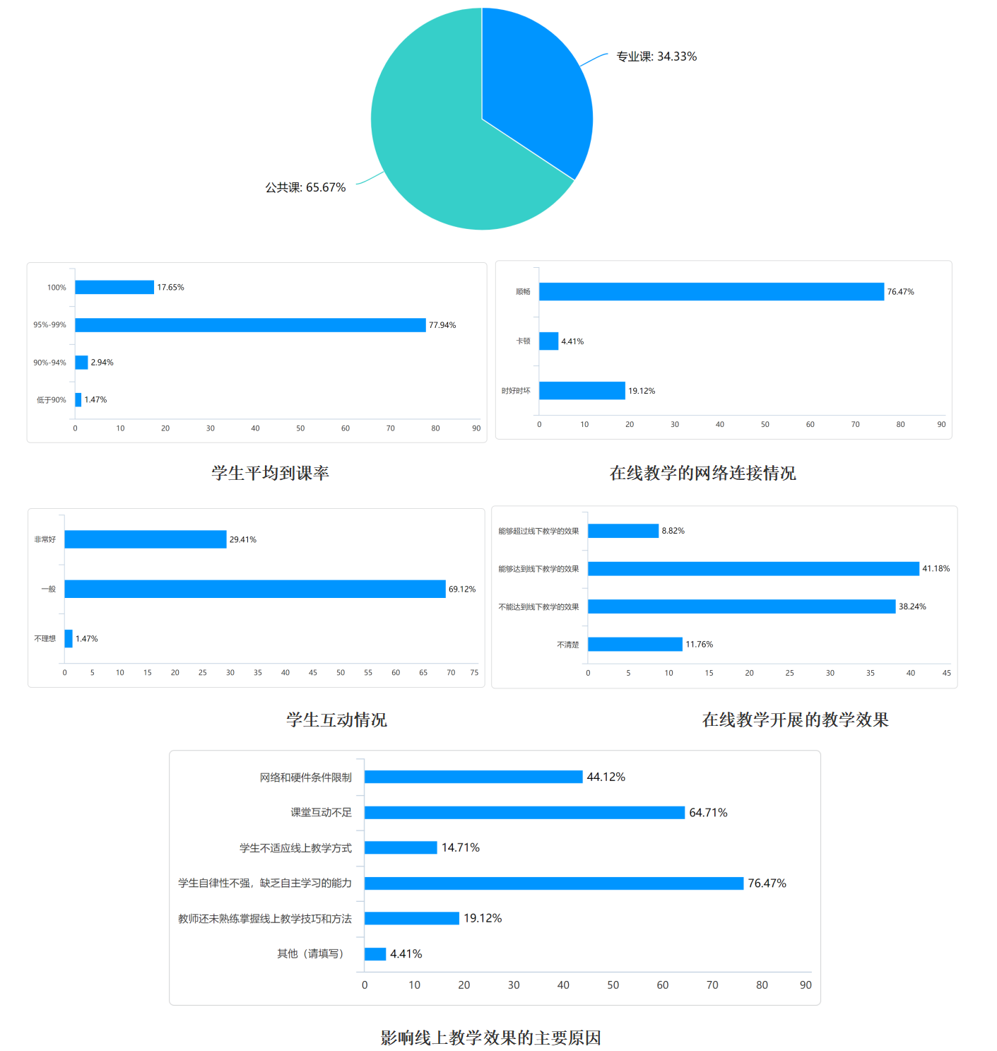 在线教学不论给教师还是学生都带来了机遇和挑战。通过此次调查,希望全院师生能够一起加油,趁着疫情下的在线教学实践,大力提升老师个人和学院的混合式教学改革再上一个新的台阶。