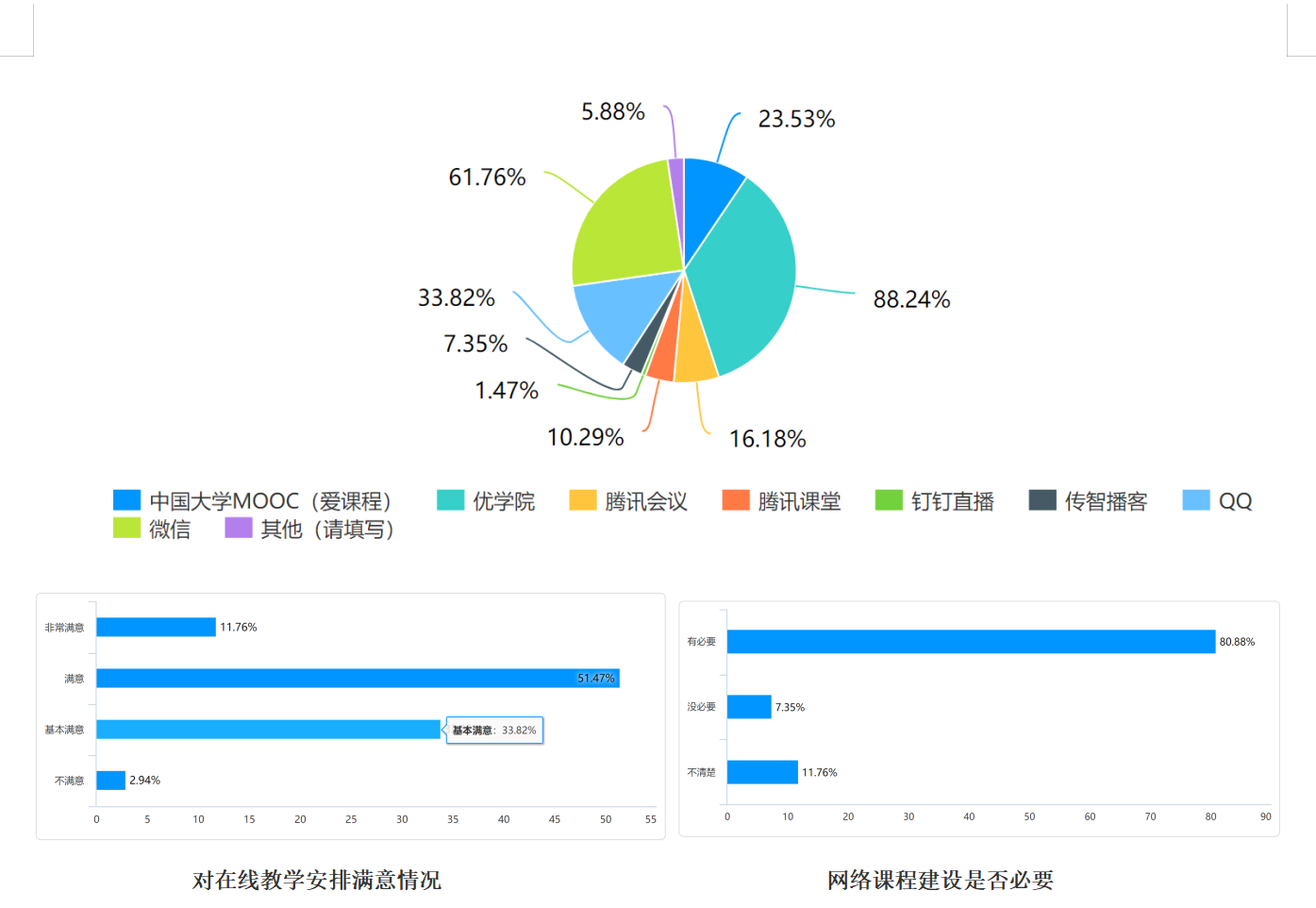 3044am永利集团官网教师选择的在线教学平台种类较多,主要是优学院或者中国大学MOOC(爱课程)+微信或者QQ互动。总体上,教师对在线教学安排是满意的,只有2.94%的教师不满意。网络课程的建设也是有必要的,有80.88%的教师认为有必要。