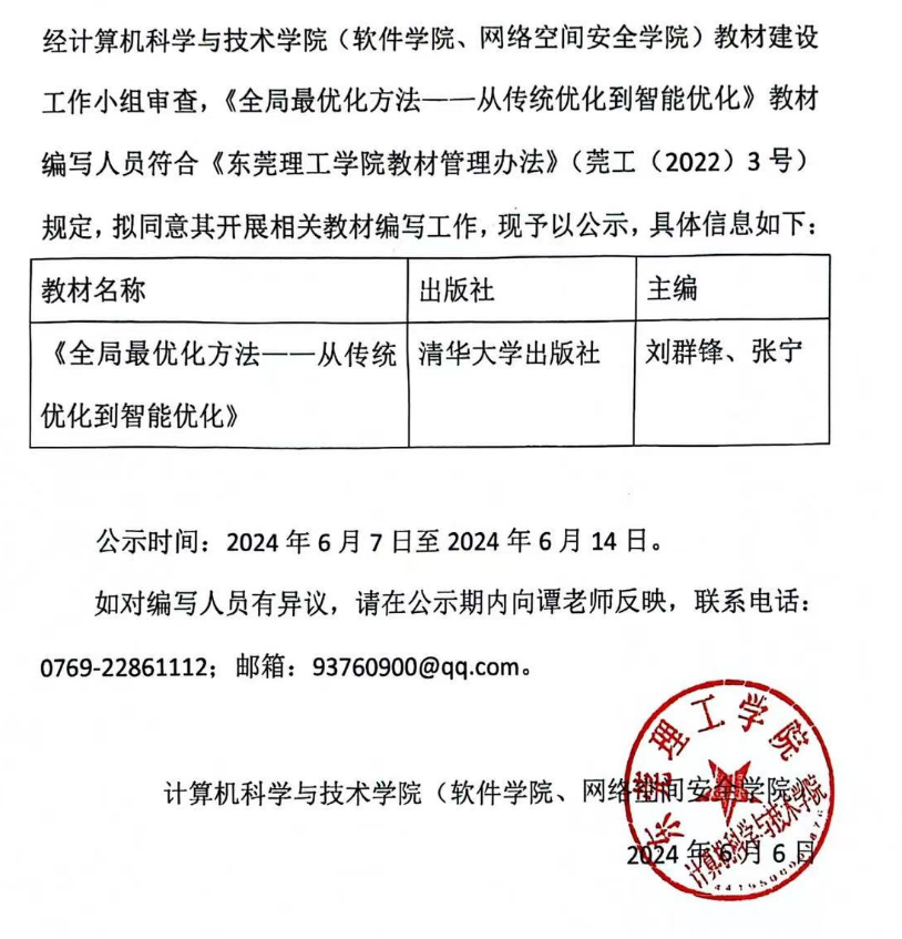 关于开展《全局最优化方法——从传统优化到智能优化》教材编写人员的公示