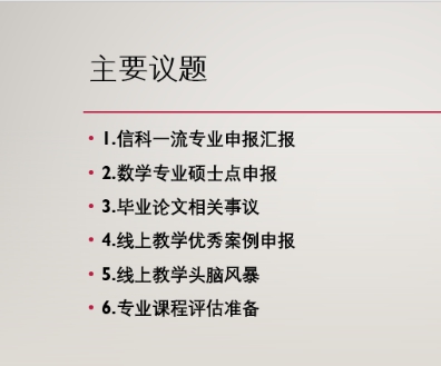 对于信科专业一流申报和数学专业硕士点申报动作,团队成员积极配合,目前相关的材料收集和编写工作已经完成;对于毕业论文,再次强调了论文的进度和质量的把控,并要求指导老师督促学生尽快完成毕业论文初稿;对于线上教学,主要讨论了教学过程中出现的问题,比如学生晚交作业的提醒方式、处理方式、教学过程中设置必要的问卷调查和答疑等了解学生学习状况等,推荐了《运筹学与最优化方法》和《线性代数》作为本课程组的线上教学优秀案例;此外,已安排两门专业课程参加今年的专业课程评估,并要求授课老师积极准备材料。本次会议大家积极发言,对于网络教学收获良多。