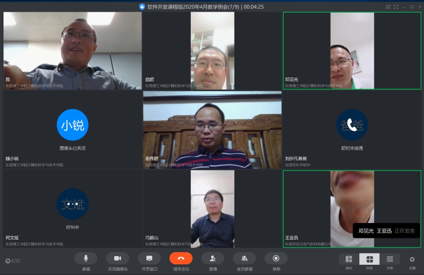 2020年4月17日晚上,软件开发课程组基于钉钉在线会议召开2020年4月教学例会,会议由赵铁柱主持,课程组成员曲超、魏小锐、何文斌、冯能山、刘立平、邓见光、王亚迅和谢伟鹏参加了会议。