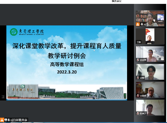 2022年3月20日下午16:00-17:00高等数学和工程数学课程组在腾讯会议平台举行了“深化课堂教学改革,提升课程育人质量”教学研讨例会。会议由肖静老师主持,高等数学和工程数学课程组全体老师参会。