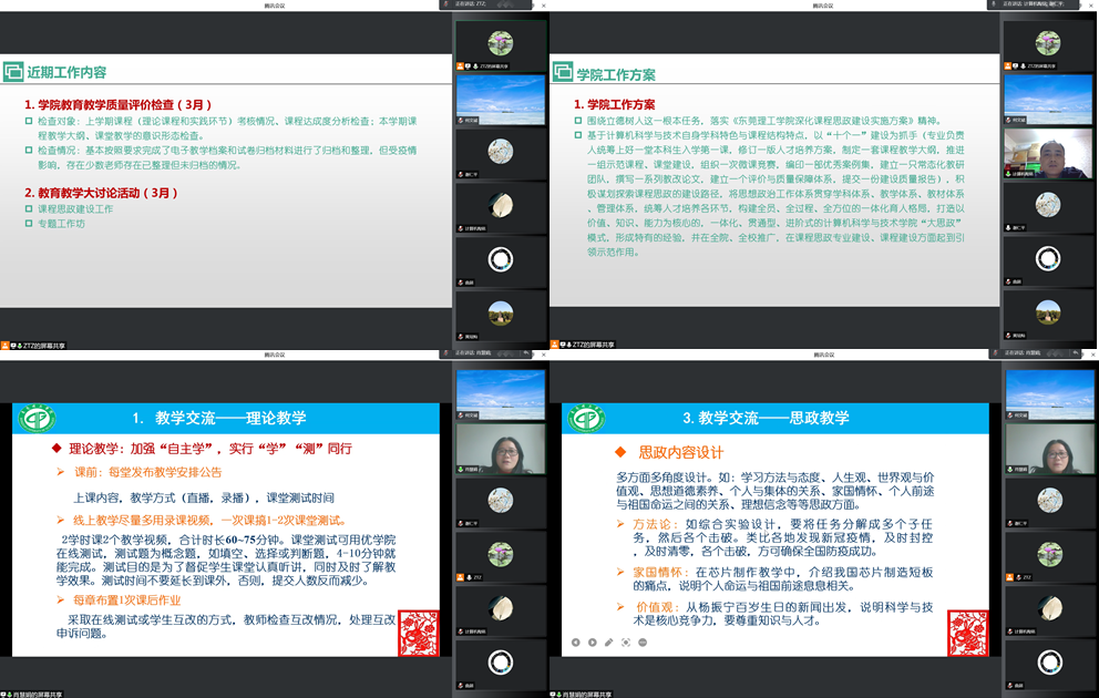 2022年3月24日下午,计算机科学与技术系在腾讯会议平台召开了线上讨论会,全体教师参加了会议。会议由系主任赵铁柱老师主持,主要围绕教育教学大讨论进行展开,并邀请了肖慧娟教授做课程思政建设的分享报告。会议同时部署了2021-2022学年第二学期教学大纲、教学课件等教育教学审查工作。
