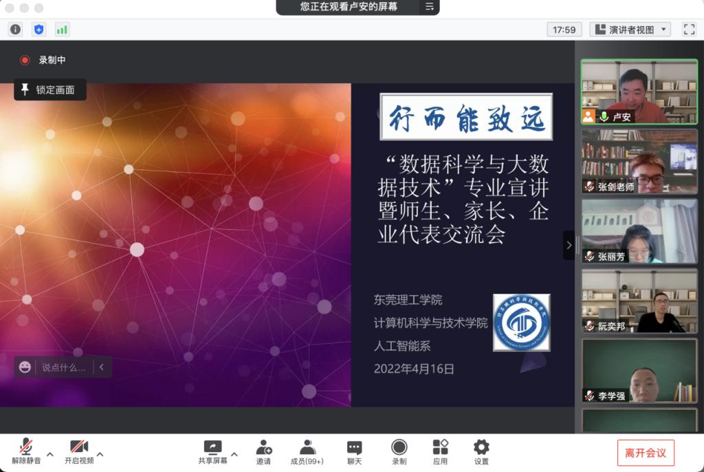 2022年4月16日上午,人工智能系在腾讯会议平台召开了线上讨论与宣讲座谈会,计算机学院2020级、2021级学生、家长代表、校友代表、企业代表、人工智能系全体教师和人工智能教师党支部全体党员近400人参加了会议,时长超过3小时。会议由系主任卢安老师主持,主要围绕“数据科学与大数据技术专业学什么、如何学、毕业去向”等方面进行了专题宣讲与讨论座谈。