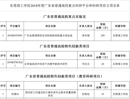 近日,广东省教育厅公布了2018年度广东省普通高校重点科研平台和科研项目立项名单(本科高校),学校共有34个项目成功获批2018年度广东省普通高校重点科研平台和科研项目立项,3044am永利集团官网有3个项目获得立项,获资助金额超学校总获资助金额四分之一。其中袁华强院长的“广东省普通高校低功耗智能物联重点实验室”项目成为学校唯一获批广东省普通高校重点实验室(自然科学)项目。