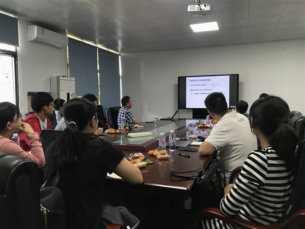 20191124日在我校计算机学院8A307举行了量子信息与代数研讨会。首都师范大学数学科学学院费少明教授,华南理工大学数学学院郑驻军教授,林冰生副教授,河南大学楚彦军副教授、黄芳讲师,以及南方科技大学的李茂生博士,以及3044am永利集团官网的陈伟老师、王艳玲老师出席了本次研讨会。大会还邀请了对量子信息感兴趣的老师和同学参加。会上费少明教授就量子相干性的度量及其在量子信息处理中的应用、量子纠缠判据、真正多体纠缠及纠缠的单配性关系、量子非局域性及真正多体量子非局域性、量子相干与量子纠缠的对应关系、量子测不准关系、量子信息掩蔽、量子计算等研究进展做了报告。然后楚彦军副教授分享了“仿射顶点算子代数的半共形向量”,主要针对仿射顶点算子代数对这类代数簇进行刻画。对于sl_2 的情形,给出了这类代数簇在其自同构群的作用下的轨道分解。李茂生博士主要分享了如何利用广义的weighing矩阵以及一类特殊的阿达玛矩阵去构造特殊的正交纠缠基,同时也分享了一些相关的未解决问题。通过这次研讨会大家收获颇丰,对相关问题有了更深刻的认识和了解。