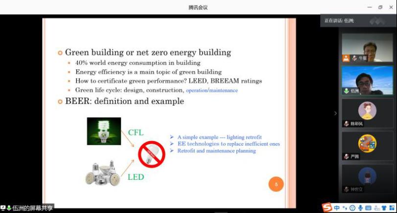 接下来是伍洲教授为我们介绍建筑节能改造中的信息论方法研究。众所周知,减少建筑能耗可有效降低全球能源需求和碳排放,因此绿色建筑受到业内广泛关注,而对旧建筑的节能改造则是提高绿色性能的重要手段。伍洲教授指出建筑节能改造的难点是改造和维护方案的优化设计,以最小化经济成本和最大化节能量;并且节能改造区别于能源层的控制和调度,它需要依靠物联网和大数据,采用人工智能和数据挖掘技术,才能做出建筑全生命周期内的最优决策。他首先为我们讲解在建筑节能改造中的模型建立中需要考虑的各种问题以及从多个维度来对建筑节能改造问题进行建模求解。而后,伍洲教授分别从优化、控制、博弈等三个方面介绍了信息论方法在建筑改造中的最新应用成果,分析了单目标和多目标、静态和动态、单方参与和多方参与等不同维度需求,提出了一些智能算法的改进和创新,为在场的教师与研究生们提供了不少优化算法与博弈论在实际应用中的思路。