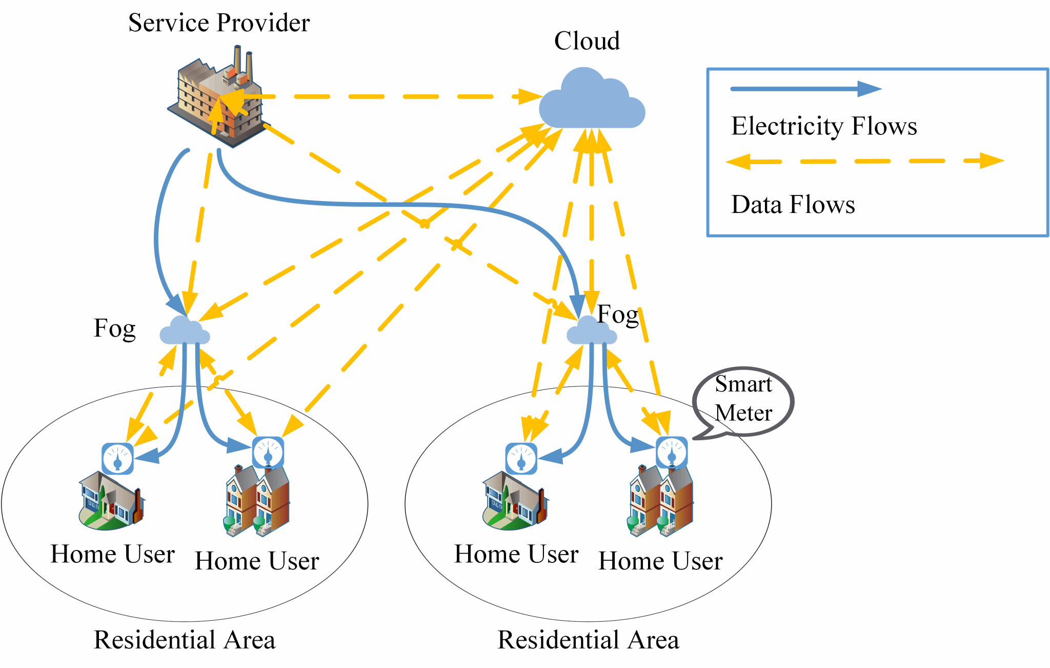 本研究提出了一个新的基于云雾协同计算的智能电网模型,并在此模型下构建了一个高效和隐私保护的智能电网方案。该方案利用秘密共享方法来实现聚合通信,并且在保护数据内容安全和隐私的前提下,支持云雾计算节点来协同检测恶意攻击者对智能电网的假数据注入等攻击行为。