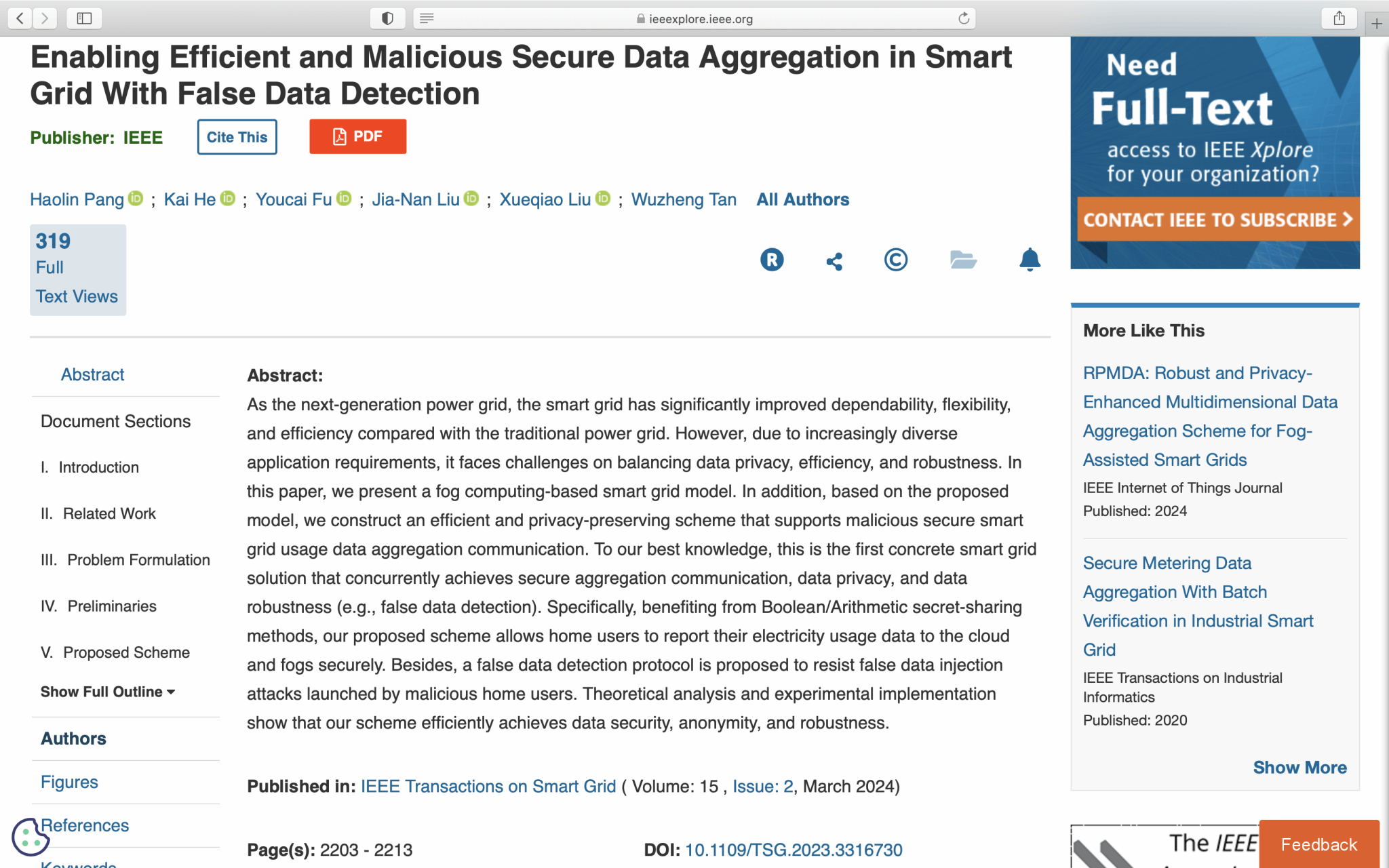 2024年3月,我校3044am永利集团官网网络空间安全系刘家男副研究员课题组在智能电网领域TOP期刊IEEE Transactions on Smart Grid(中科院SCI 1区期刊,T2期刊)发表了题为“Enabling Efficient and Malicious Secure Data Aggregation in Smart Grid with False Data Detection”的研究论文。我校2020级硕士研究生庞浩霖为论文的第一作者,刘家男副研究员为论文的通信作者,我校何凯副教授、澳大利亚伍伦贡大学Xueqiao Liu副教授与暨南大学谭武征教授为论文提供指导并署名。
