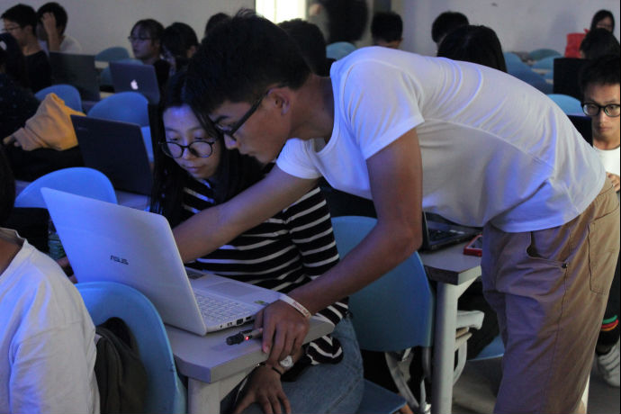 在公开课未开始之前,工作人员帮助到场的同学安装AE软件,并指导他们进行初步使用AE软件。公开课伊始,施雨帆师兄给同学们讲解了AE软件的一些基本工具的使用和界面的基础操作,并现场制作了一个小视频――火焰飞人。在他为大家详细讲解视频制作之余,也不忘停下来询问同学们是否存在疑惑。在场的同学们都在很认真的学习,并在自己的电脑上练习操作。遇到疑问,工作人员也会热情地帮助他们解答疑惑。