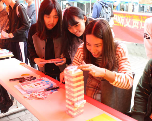活动伊始,志愿者在学生公寓广场附近及第一饭堂前派放宣传单,并引领学生抵达活动现场。来访学生可以在宣传标语上签名,以及聆听志愿者讲述“艾滋病的有关知识”和“预防艾滋病的小知识”等。接着,进入玩游戏环节。参与同学可以通过问答游戏、玩纸迷宫、层层叠积木等游戏获得小红花,也可以在真人版飞行棋中通过掷骰子到达不同颜色区域来赢取红丝带、小红花。最后,学生可以凭借获得的小红花换取套环来参与抽奖环节。幸运套中者可通过转发推文便获取精美的小礼品。参与的同学积极性很高,并且极大部分同学都幸运地拿到了各式各样的小礼物,还可以获得红丝带作为纪念品。