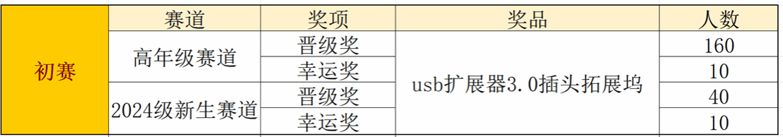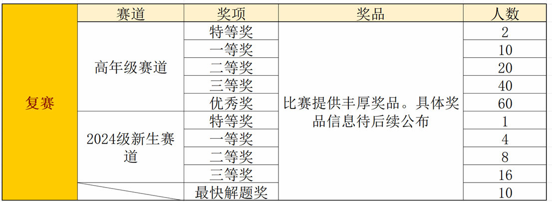 为鼓励新生参赛,本次比赛初赛和复赛特设新生赛道。新生可参加新生赛道,也可以挑战高年级赛道,但只能挑战一个赛道。两个赛道难度相同,但新生赛道只有新生参与排名。