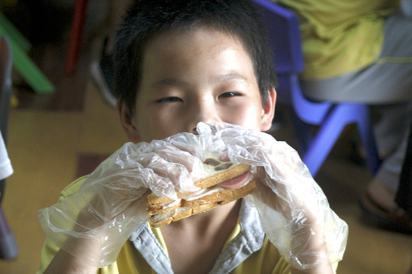 活动开始时,工作人员先播放了十分钟的动漫,充分地活跃了现场气氛。接着又播放了一些有关生活小常识的视频,并就视频里的内容进行提问。孩子们踊跃回答,在收获了奖品的同时,也增长了不少知识。然后,志愿者们手把手教孩子们制作三文治面包。有些孩子十分聪明,在志愿者们还没教他们的时候,就已经做出了三文治,并利用火腿肉,在面包上摆出了一个个笑脸。制作完成后,大家一起吃掉了自己制作的三文治,每个人都十分的满足与幸福。本次活动在不知不觉中进入了尾声,志愿者打扫现场后与社工进行心得交流。