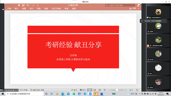 紧接着刘紫薇辅导员播放了一段来自计算机学院研究生党支部的鼓舞视频。视频详细的讲解了考研是否有必要,是否需要孤注一掷,在考研过程中选择与努力的关系,考研中的重要因素,所报考专业课以及导师的选择和考研失败该怎么办,劝导各位在备考中的同学不要迷茫,勇敢的去选择适合自己的目标院校和专业。