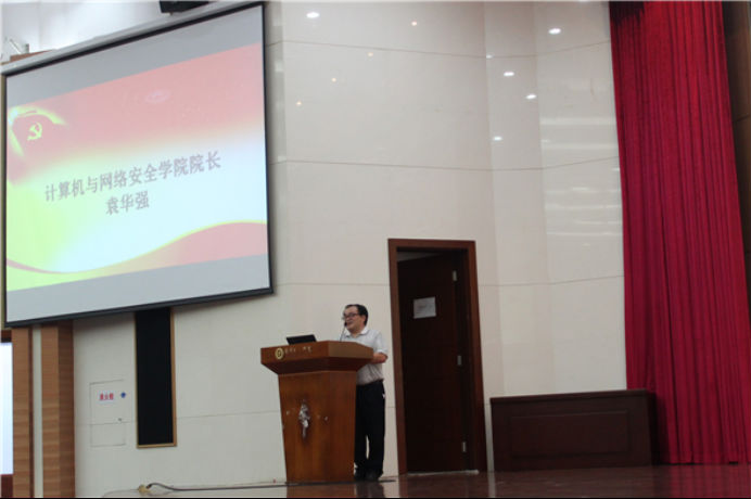 本次担任主持人的是路晓军书记。活动伊始,路书记宣布开班典礼开始并介绍到场的领导和嘉宾。接着,路书记依次邀请了马宏伟副校长和袁华强院长上台发言。马副校长和袁院长的发言都着重提到了我校的办学模式。它不仅得到了教育部的高度认可,更得到了中央党建办领导的认可。随后,教师代表和学生代表上台发言,依次阐述了他们对网络安全的感想。当活动接近尾声,路书记邀请360集团的工程师裴智勇上台演讲。他为在座的360网络安全学院的学生介绍了许多网络安全的相关知识,多次强调网络安全的重要性,没有网络安全就没有国家安全。