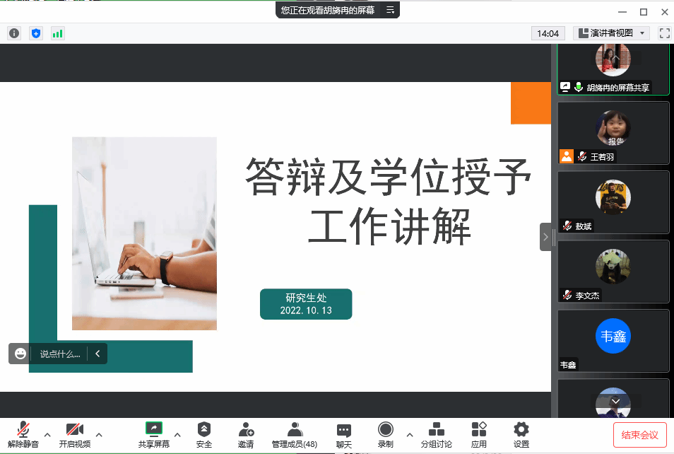 2022年10月13日下午15:00,计算机科学与技术学位点以线上会议形式召开2023届研究生毕业就业动员大会。本次会议特邀请研究生处胡旖冉博士作培训报告,旨在加深研究生应届毕业生对毕业论文与答辩等重要事项、时间节点的认识,为顺利毕业就业提前做好相应准备。本次毕业就业动员大会由3044am永利集团官网辅导员王若羽主持,学院教务老师谭胜兰及2020级3044am永利集团官网硕士研究生参加了此次大会。