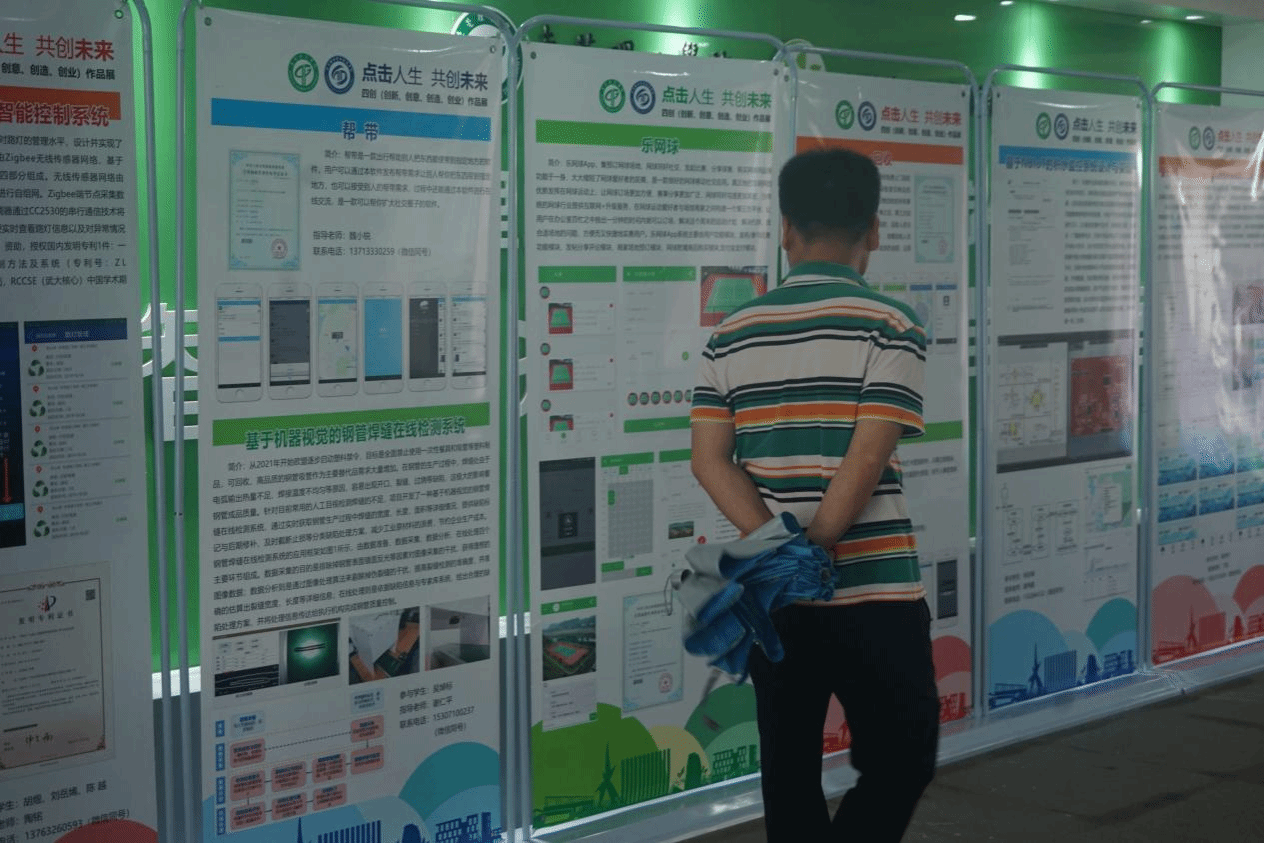 学院精心准备“创新、创意、创造、创业”四创作品展,通过浓缩凝练的宣传展架,向来访家长和学子展现了学院蓝桥杯大赛及获奖情况、计算机设计大赛获奖项目、“互联网+”和“挑战杯”项目等资料,同时展示了基于红外热成像技术的消防侦察灭火机器人、基于机器视觉的自主导航湖面垃圾回收无人艇、物联网智慧排程柔性制造系统等研究成果,很好地呈现了学院专业特色和人才培养成果。