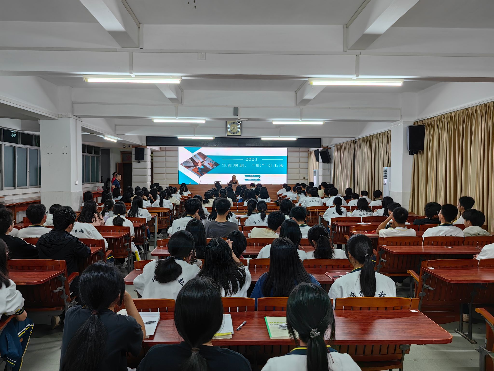 两天的时间里,学院招生小组一行6人,分别走访了茂名市信宜中学、信宜一中、高中中学、高州一中、高州二中、高州四中等多所中学,为每所中学送去关于2023级本科生录取的喜报,同时就学校校史校情、师资力量、办学特色以及计算机学院的专业设置、毕业生就业情况等展开交流。为引导高中生生涯规划意识的觉醒,招生员田盛兰为信宜中学高三年级的同学们送去课程《生涯规划,“职”引未来》,在场同学聚精会神、认真聆听。