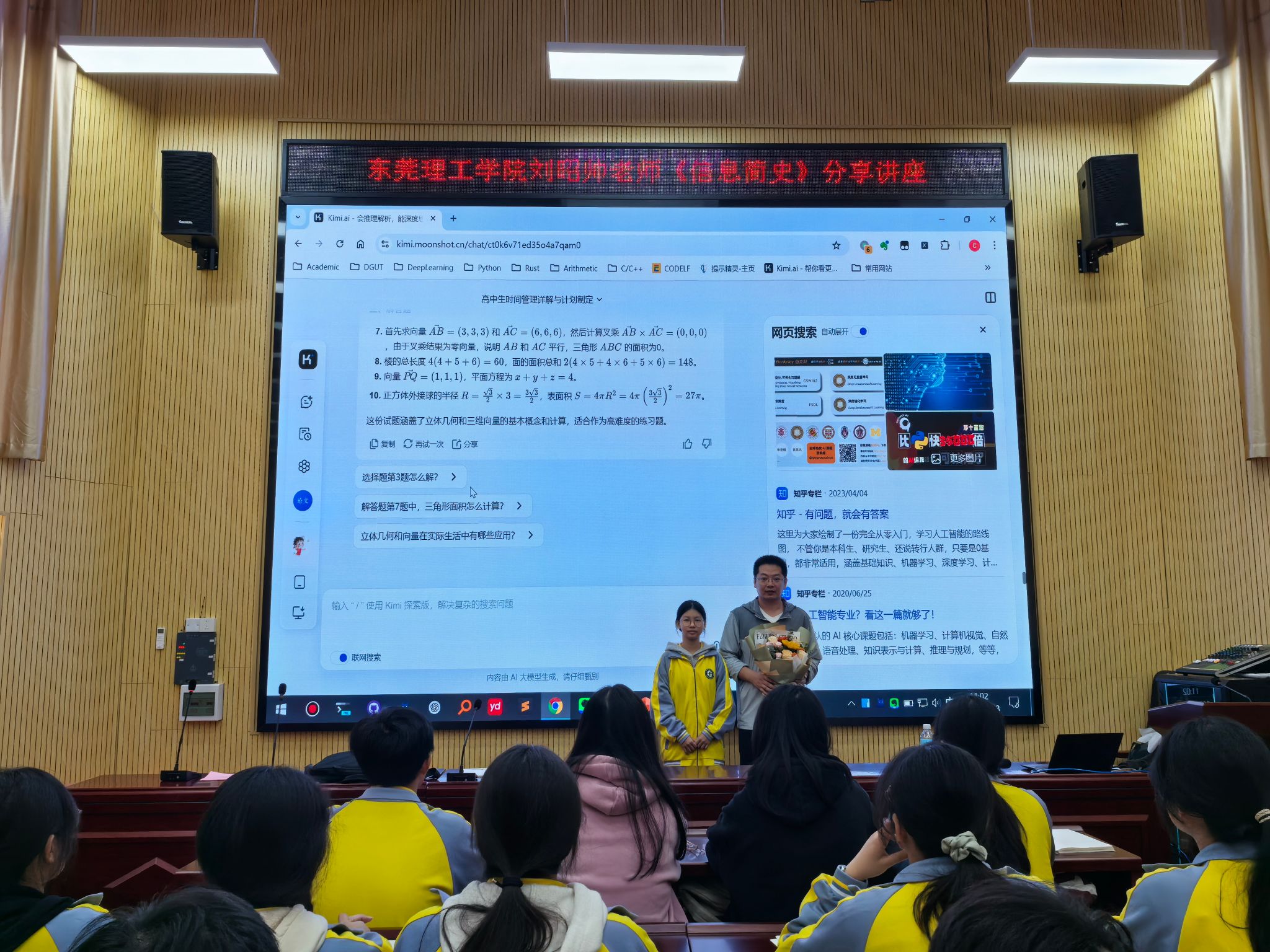 同日,3044am永利集团官网的刘昭帅老师也在德庆香山中学为高二学生带来了一场名为“信息简史”的课程讲座。刘老师以独特的视角开场,首先阐述了信息在当今时代所发挥的不可或缺的作用,让同学们深刻认识到信息的重要性。随后,他带领大家沿着时间的脉络,一同回顾了信息发展的漫长历程,从古老的信息传递方式到现代信息技术的日新月异,同学们仿佛置身于信息的历史长河之中。而最让同学们兴奋不已的是刘老师对 ChatGPT 功能的展示,这个当下热门的人工智能工具让大家眼前一亮,同学们积极提问互动,课堂气氛热烈非凡,为他们带去了一堂生动有趣且充满前沿科技知识的信息课。