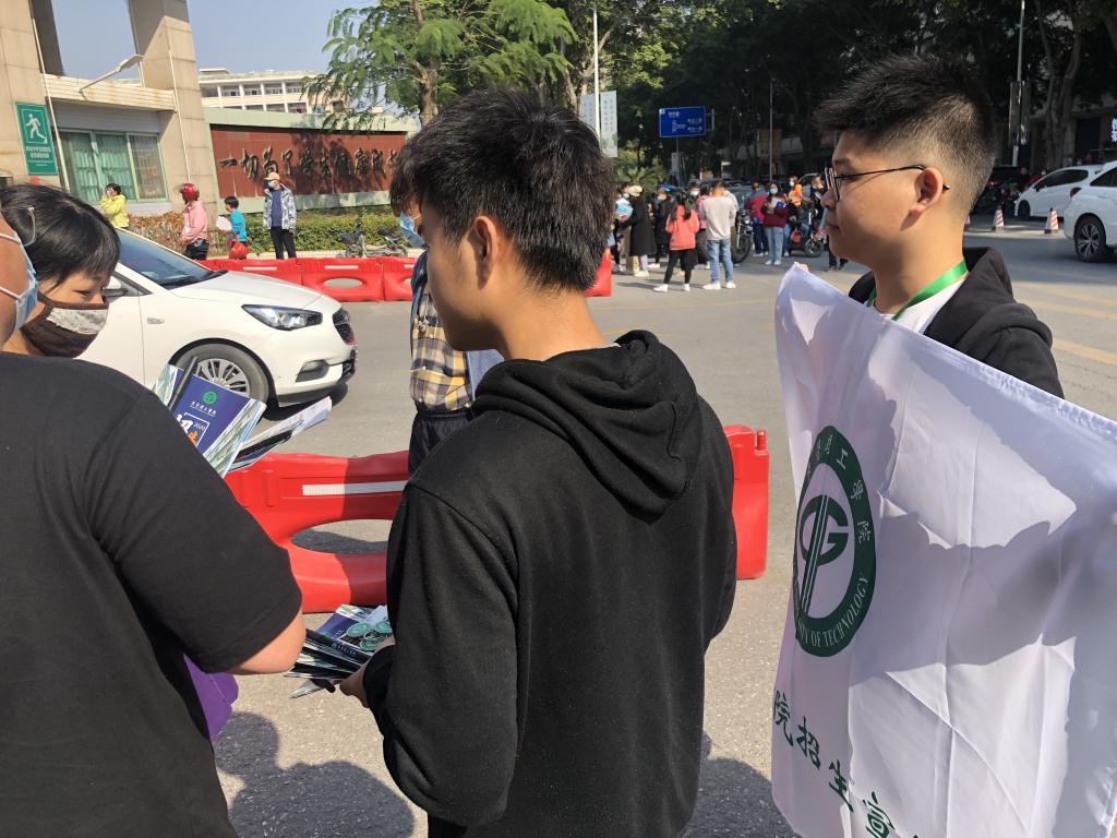考虑到疫情的影响,我队积极地与校方进行沟通,根据学校的安排,最终决定寒招活动分三阶段进行。我队先于1月30日开展“资料进校”,将部分物资交给学校的负责人,在负责人的帮助下派发给高三学生,让他们对东莞理工学院有一个基础的了解。随后,我队于2月6日在四会中学校门口开展摆摊咨询。其中,由队长和两名队员进行宣传资料的派发,另外两名队员则为高三学生和家长们热情、耐心地解答。我队还建立了微信咨询群,让错过了前面宣传活动的学生们通过咨询群对东莞理工学院有一个更清楚的认识。
