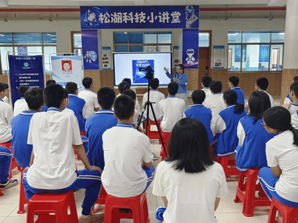 首先,邓武均老师代表学院向东莞中学赠送学校2022年本科招生简章、招生手册及高考志愿填报指南等招生宣传资料,并播放学校招生宣传片。其后,张剑老师进行“ChatGPT,变革与风险”主题授课。张剑老师从ChatGPT的发展历程和基本原理、测试应用实例、对工作生活的影响以及东莞理工学院NLP组的研究内容与ChatGPT的关联几方面展开分享,同时穿插介绍东莞理工学院,将招生宣传工作与科技讲座进行融合,形式新颖,寓教于乐。在场学生聚精会神、兴趣盎然。
