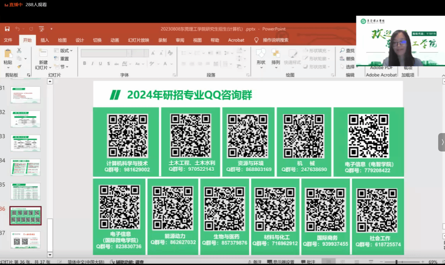 会上,张宁老师先介绍了我校办学历史、办学规模、特色及我校创建高水平工科大学重要举措;重点解读了计算机科学与技术专业的招生政策。随后,张老师介绍往年学院考取研究生情况。让广东科技大学的考生们了解本学位点的教育特色、培养条件和招生政策,激发同学们的报考热情。