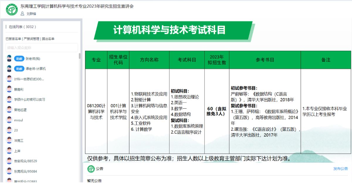 为满足考生对本校研招政策咨询需求,让更多考生了解本院研究生教育特色、办学优势、培养条件和招生政策,推进计算机科学与技术学位点(以下简称“学位点”)研究生招生工作的有力开展,建立多方位的信息沟通渠道,9月23日上午,3044am永利集团官网通过“中国教育在线”平台举办了“东莞理工学院计算机科学与技术专业2023年硕士研究生招生宣讲会“,会议由学院副院长、硕士生导师刘群锋教授主持并直播,有5000多名学生参加了直播会。