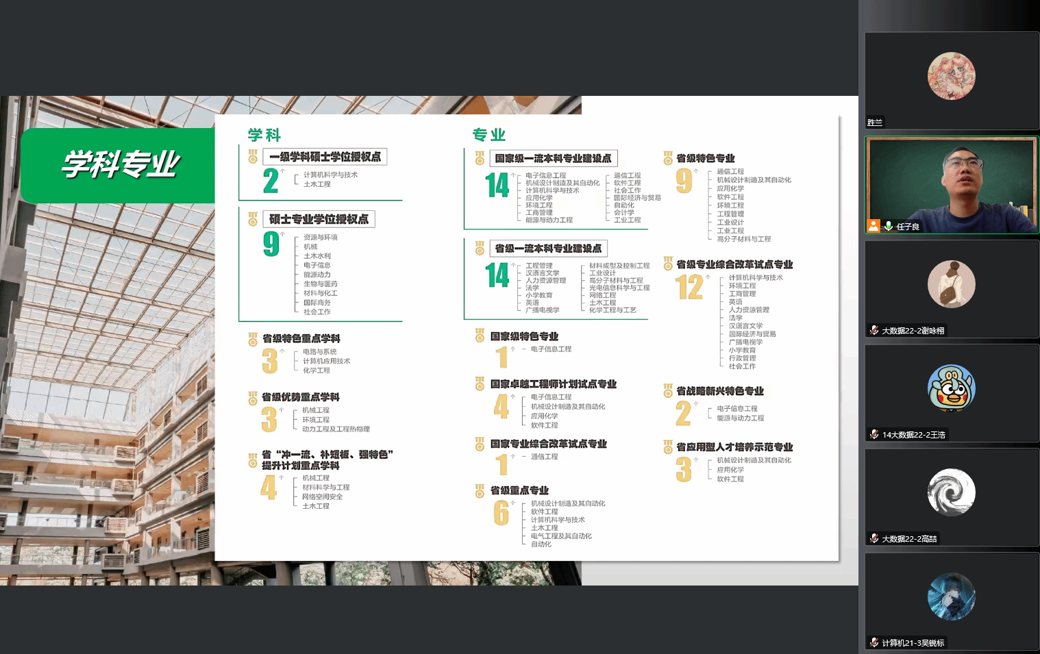 2022年10月13日下午,计算机科学与技术学位点以线上会议形式向广东石油化工学院开展研究生招生宣讲会。让更多考生了解本学位点的教育特色、培养条件和招生政策,激发同学们的报考热情。宣讲会由3044am永利集团官网任子良老师主持,学院教务老师谭胜兰辅助,针对考生关心的问题进行了详细解答,使考生能够在第一时间获取意向专业的最新考研资讯及院校相关信息。